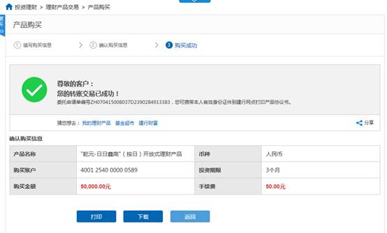 购买成功。可进入“投资理财”-“理财产品”-“我的理财产品”,查看并管理理财产品交易信息。