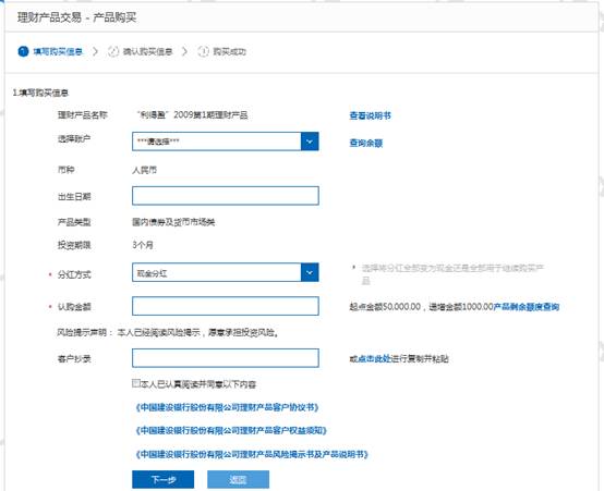 登录个人网上银行,进入“投资理财”-“理财产品”-“理财产品超市”,查看产品列表,选择产品,点击购买按钮。