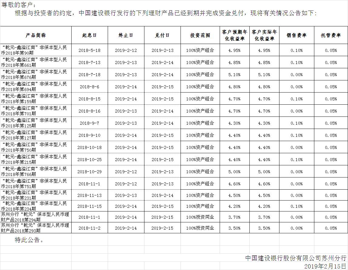 中国建设银行理财产品终止及清算公告