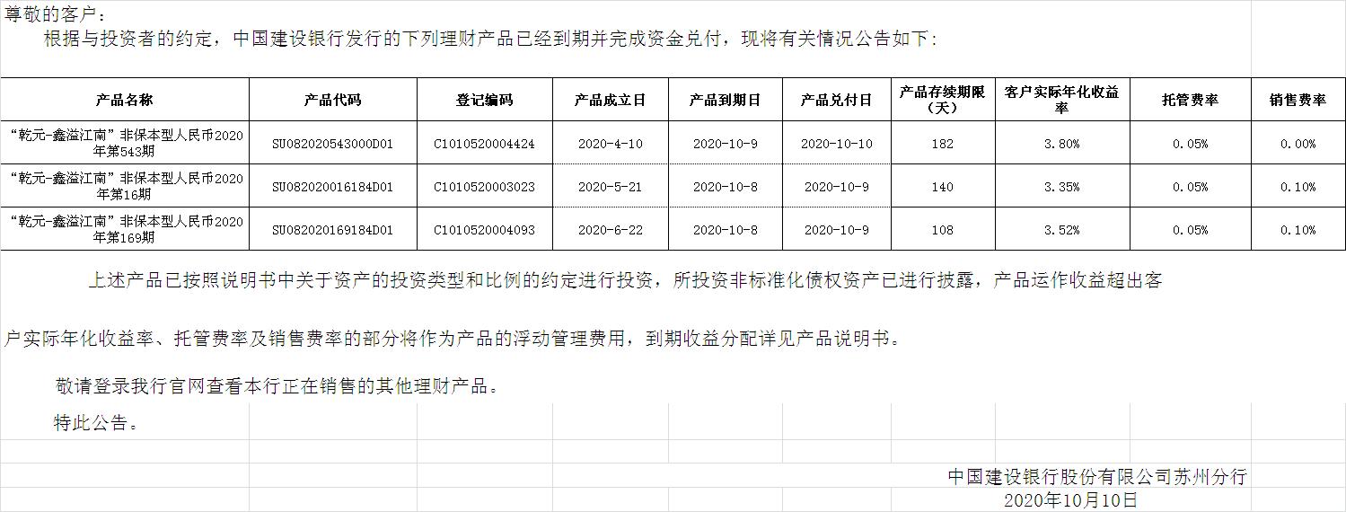 中国建设银行理财产品终止及清算公告